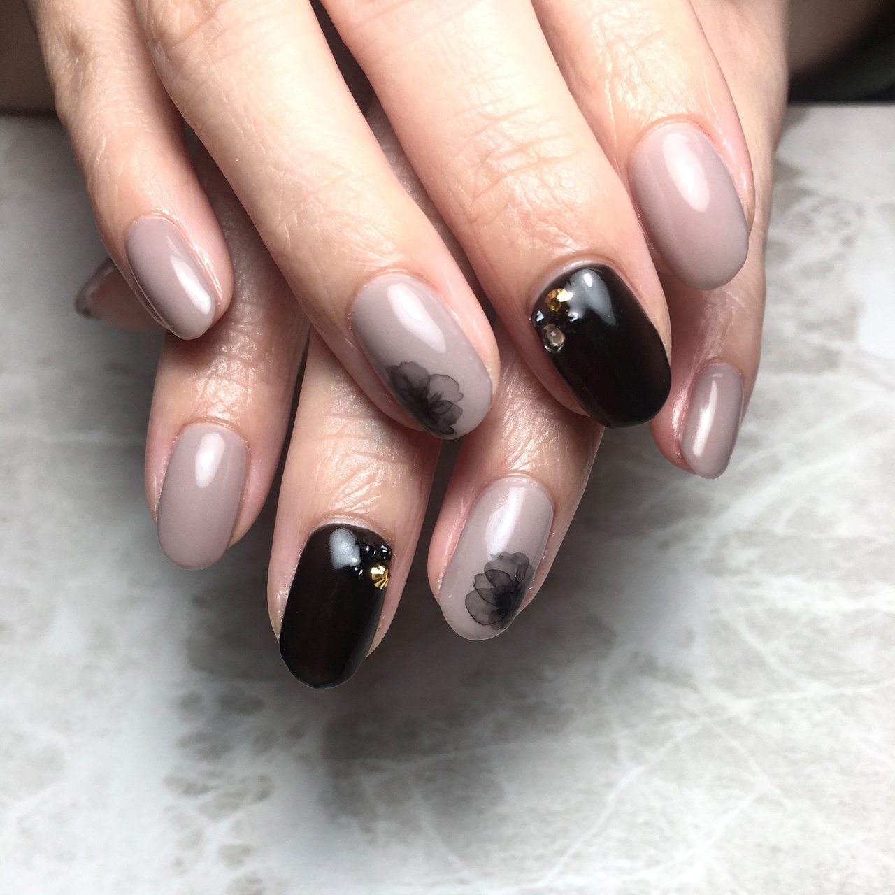 nail salon&school_アンベリール posted on Instagram "エアジェルでグレーのグラデーション またまた私と同じアートさせて頂きました(*^^*) いつもありがとうございます ️" • See all of @yukari1003's photos and videos on their profile#セルフネイル #セリアジェル #たらしこみネイル #大人ネイル #100均ネイル セリアジェルでグレージュを作って大人カラーに挑戦ネイルプリンター専用デザインjpegデータ 難易度高めのたらしこみフラワー♪オフィスにも 大人シックなカラー。 こちらは人差指推奨デザインです。 シアーカラー推奨デザインですのでベースジェルの次に塗られる下地カラージェルを真っ白ではなく無色透明のシアーホワイト(乳白色)を